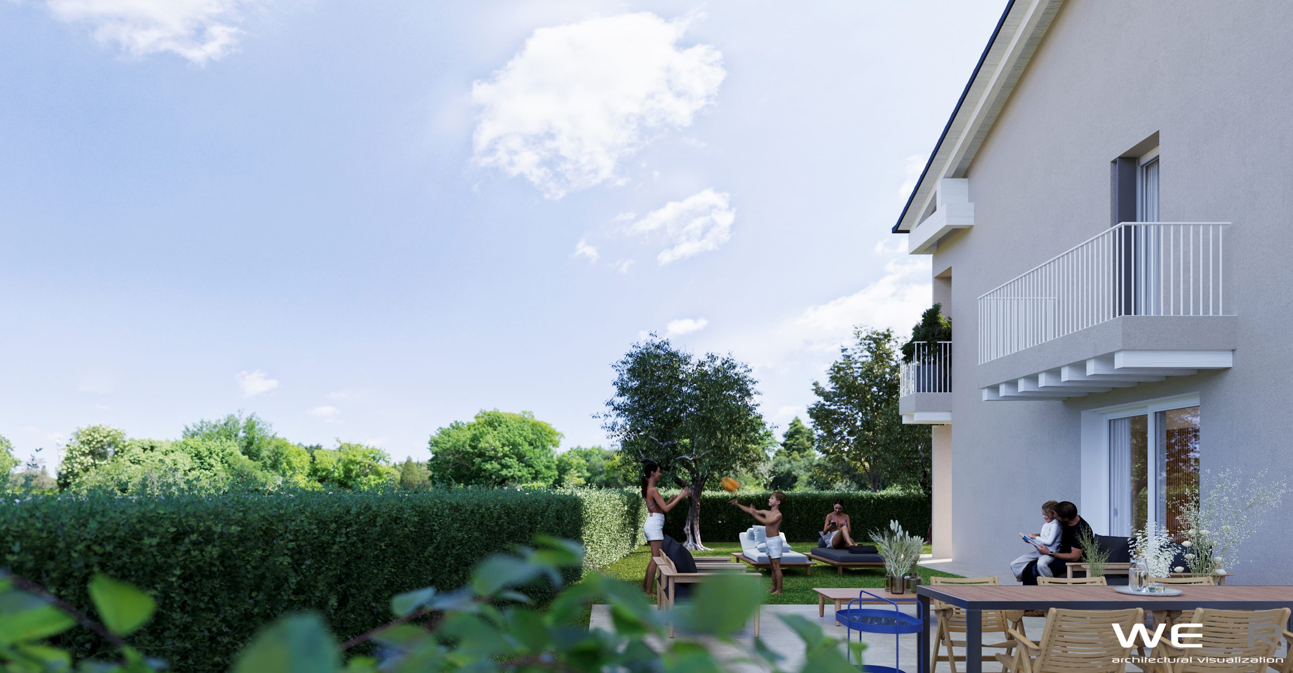 5 unità indipendenti immerse nel verde. Una concezione dello spazio interno ordinato e funzionale, orientato verso l’esterno, adeguato al vivere contemporaneo