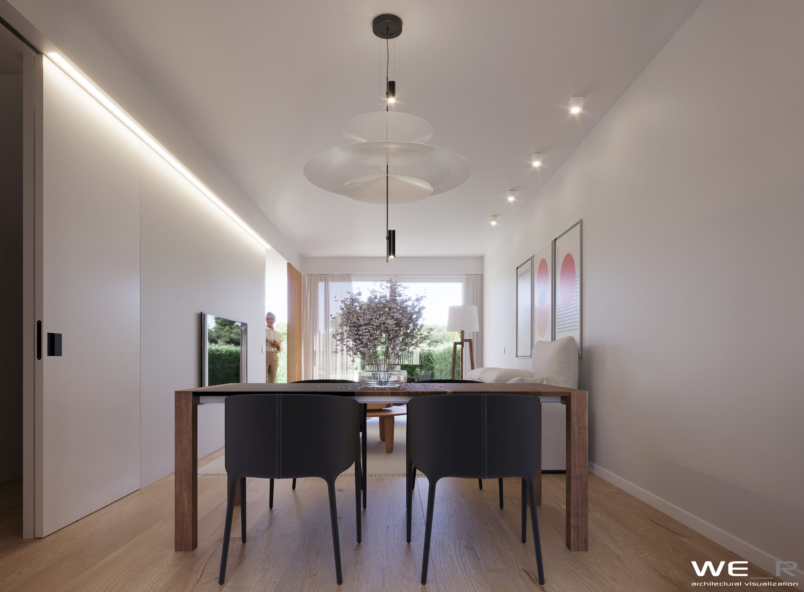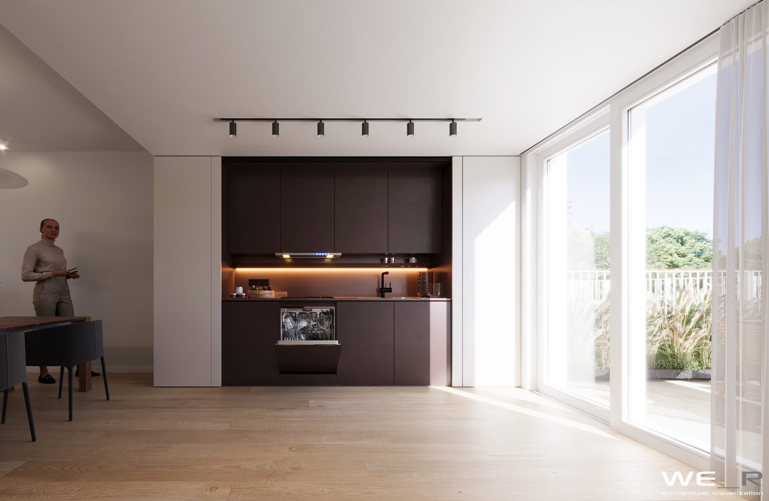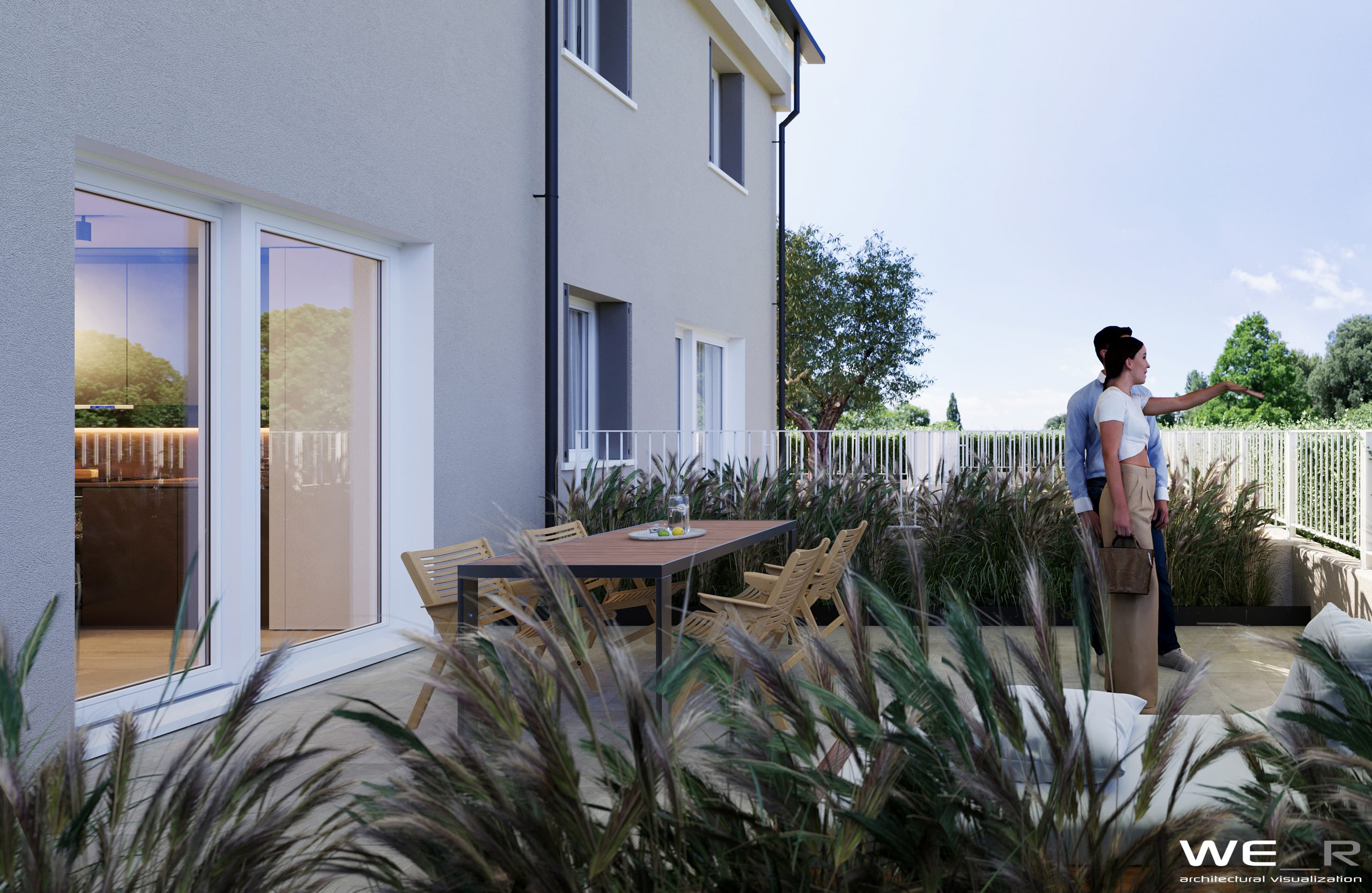 Esternamente si apre la vista sul verde grazie alle ampie vetrate e giardino privato per ogni abitazione.