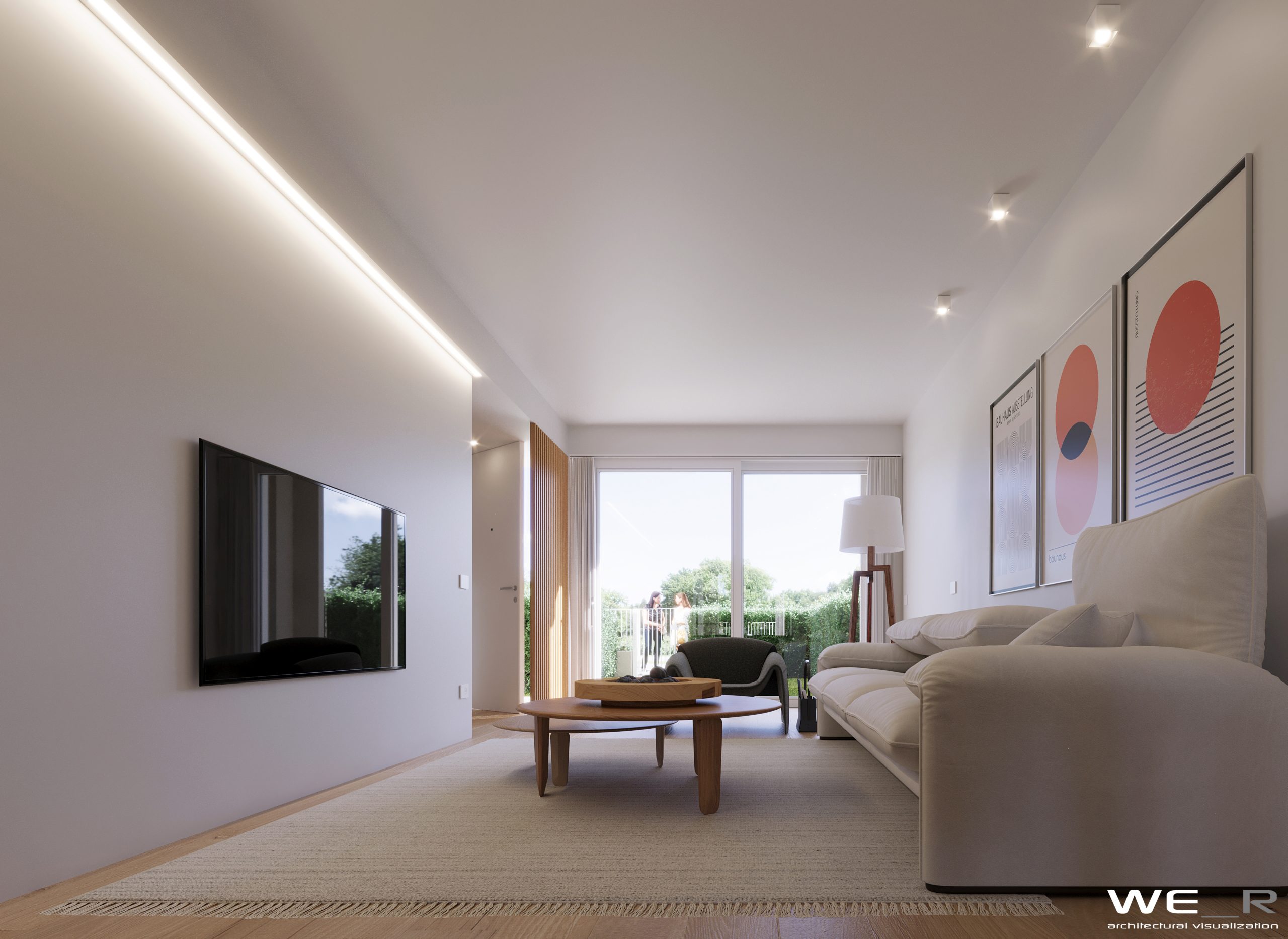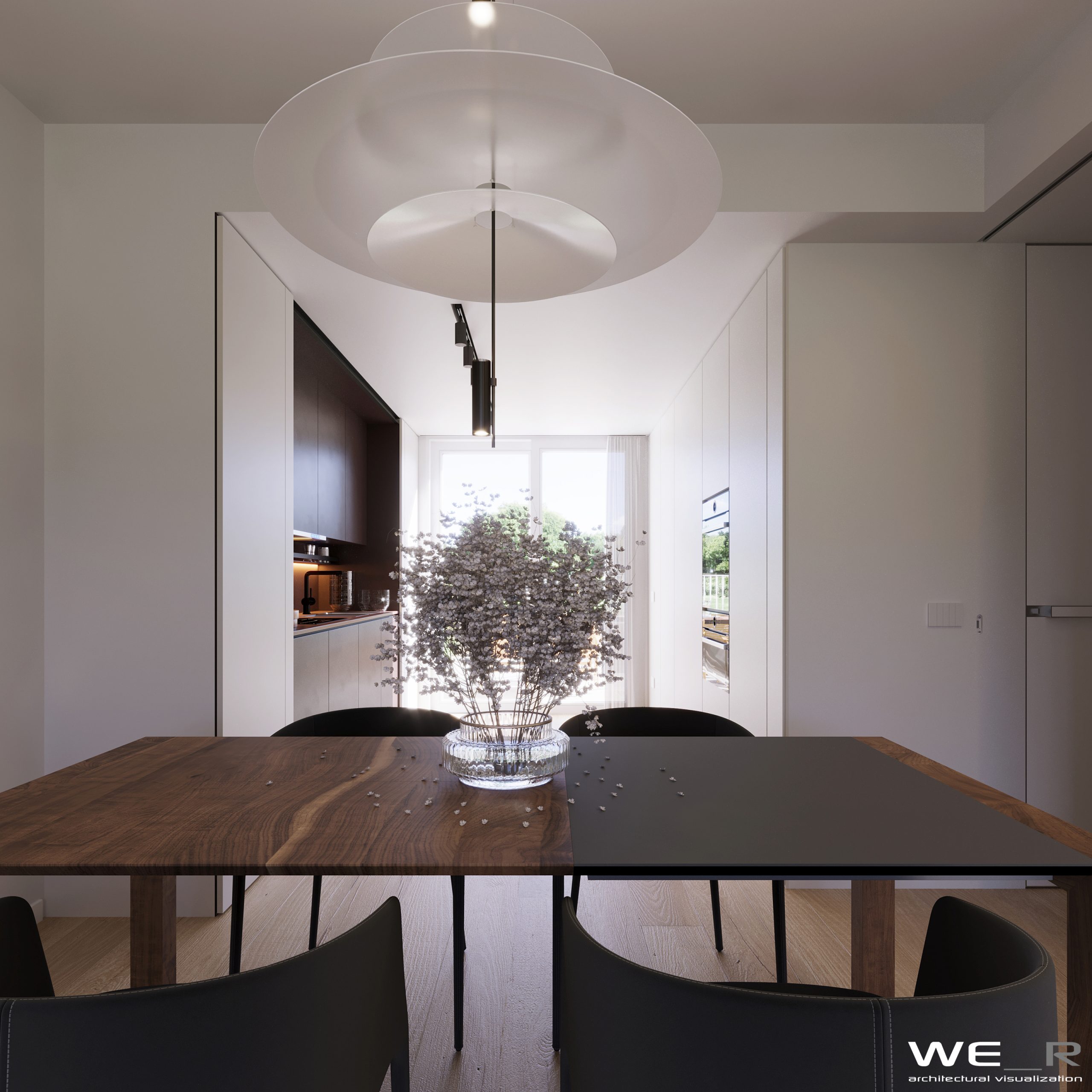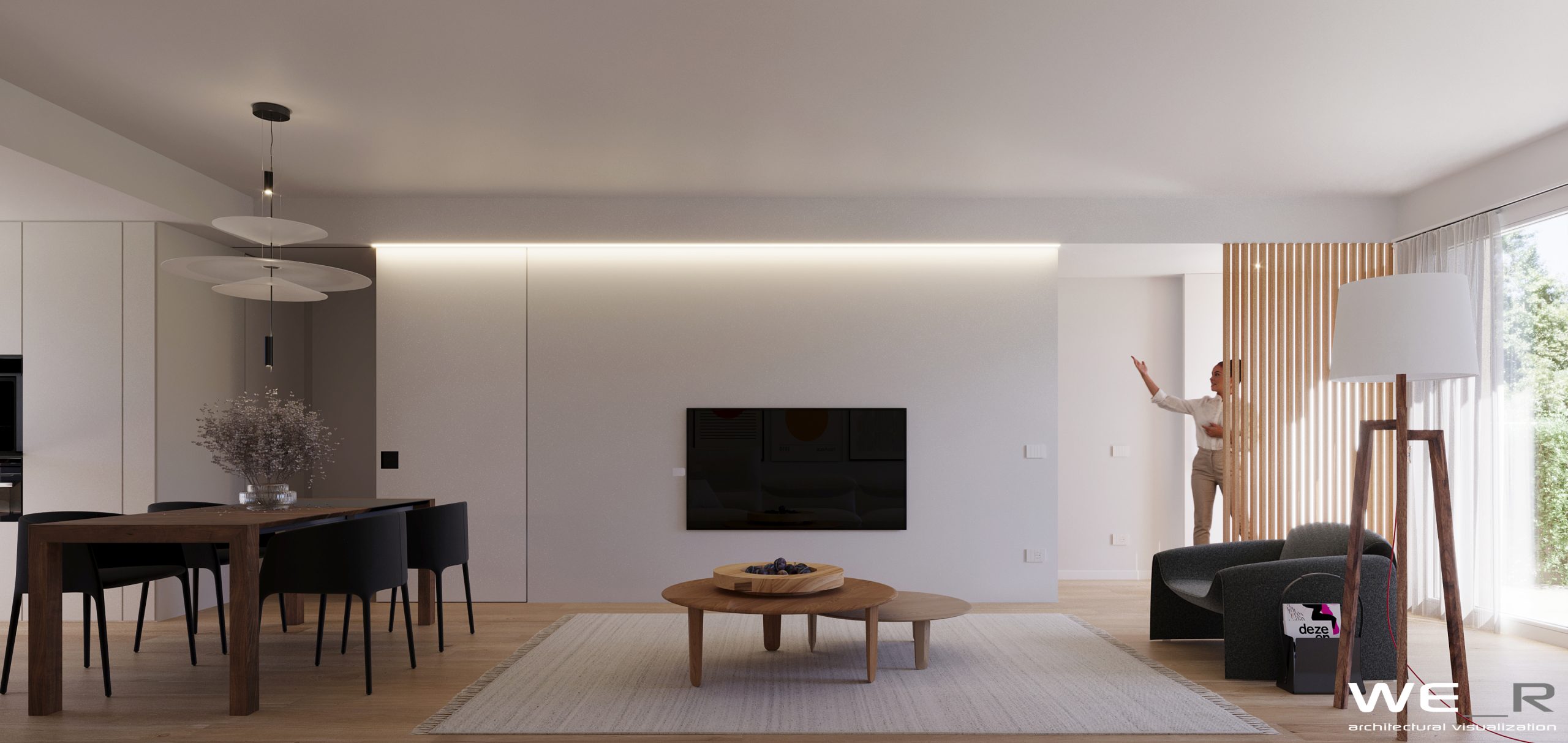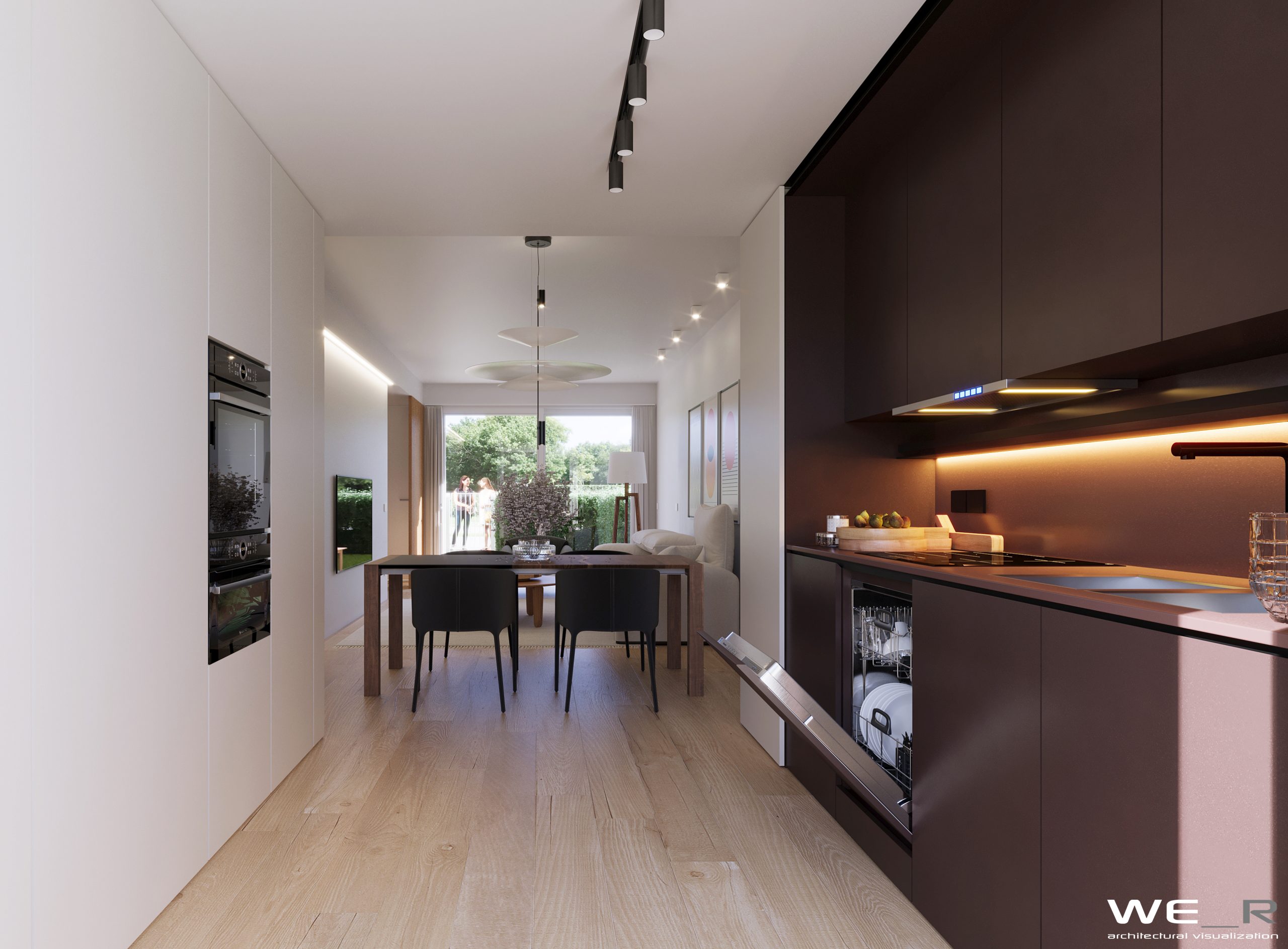 Esternamente si apre la vista sul verde grazie alle ampie vetrate e giardino privato per ogni abitazione.